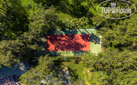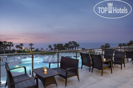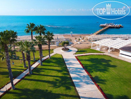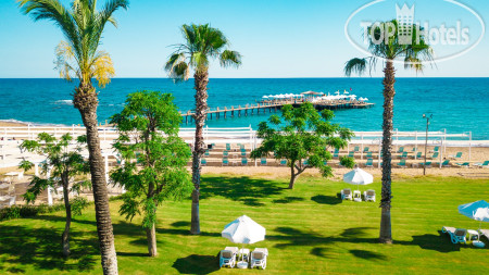 Территория отеля довольно приличная по размеру. Само здание делит её пополам, со стороны моря, в основном, газоны и пальмы, а с другой стороны (со стороны дороги) больше различных деревьев (много кедров) и зелени, в этой же части находится и аквапарк. Эта сторона отеля тихая и больше подойдёт тем, кому вечером не нужен шум. Внутри самого отеля есть несколько магазинчиков, парикмахерская, медпункт. На территории есть теннисный корт, сцена, места для отдыха под деревьями и очень хороший пирс с баром. Как и много где в Турции, на территории отеля очень много кошек. Один раз даже видели черепаху рядом с нашим номером, кормили её персиком.