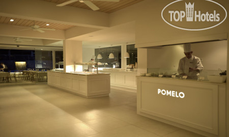 Называется он Pomelo. В нем проходил завтрак (с 7:00-10:00), обед (с 12:30-15:00), ужин (19:00-21:30). У меня был включён завтрак и ужин (который можно поменять на обед, если это нужно). В ресторане не большой зал с видом на бассейн. Питание в формате шведский стол. На завтрак был всё время один и тот же набор блюд, (омлет, фасоль, сосиски, бекон, грибы, драники, нарезка нескольких видов сыров, мяса, св. огруцы, помидоры, йогурты, орехи, сухие завтраки, фрукты, выпечка- великолепная), всё съедобно, вкусно. Также, можно было заказать и при тебе приготовят яичницу и/или блинчики (к ним было несколько топпингов). Из напитков чай, кофе, сок.