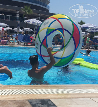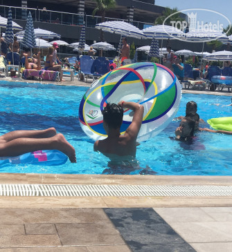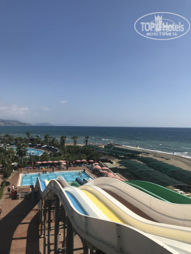 Мы и сейчас здесь. С 26го марта по 4 апреля брали тур. К самому отелю нет претензий. Чистый, новый, вообще не к чему придраться. Огромные номера, по моему 45 квадратов. Круглосуточно работает Бургерная и Лобби бар. Бывало и ночью ходили суп кушали. В 8 вечера в баре у бассейна проходит детская, а потом и взрослая дискотека. Лифтов аж 8! С детьми процентов 90 посетителей. Для детишек реально рай. Свой аквапарк. Мороженое в упаковках. До пляжа 5 минут. Правда сам пляж не очень. Нам после пляжа Дамлаташ в Алании не очень понравился. Заход по бульникам и очень пологий. 50 метров, а всё по пояс. Это единственный минус. При заезде в отель, слво за строящимся торговым центром конечная остановка 50 го автобуса. 55лир, 20 мин и вы приезжаете на Бас стейшн в центр Алании, за Вайкики. Рядом левее от отеля есть Мигрос, 10 минут идти. Мы из-за пляжа уже 3 раза съездили на пляж Клеопатра. С детьми смело берите. Вот прям честная пятёрка.В самый разгар сезона наверное будут ньюансы.. Очереди в столовой и постоянный крик детей.С самого пляжа у моря в принципе можно вообще не уходить. Куча ресторанов, бесплатных, по моему 4 . А главный Фуд Корт до 16.00. Еда та же что и в центральном рестике в отеле.Сам пляж хорош для детишек,из за того что огорожено насыпью то получается бухта.Бухта это миниум волн ,заход очень пологий.Но при этом песок вперемешку с камнями,а это не очень комфортно.Номер у нас был не на бассейн с морем, а на другую сторону,можно взять на море с доплатой 50 долларов.Или заселиться в номер со своим личным бассейном за 150 долларов.Еще прикольная фишка,вай фай работает на расстоянии 200 метров вокруг отеля.Тоесть дойти ло банкомата и снять деньги это легко.Видно что отель новенький.