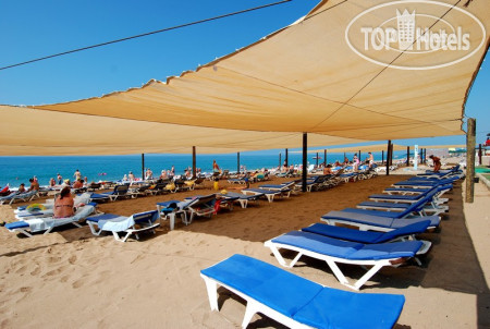 В карточке отеля указано, что до пляжа 400 метров, ерунда! Около километра наверное, с ребёнком 4 года шли примерно минут 15. Если приходить на пляж не позднее 8.30, то можно найти свободные шезлонги, позднее уже всё занято, только платные свободны. С 10 утра работает бар (вода, кола, Фанта, спрайт, кофе).  Пляж галька-песок, неудобен для детей, т.к. метр мелко, в дальше резко глубоко. Пляж грязноват, везде валяются бычки. Есть душ.