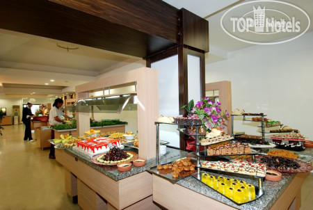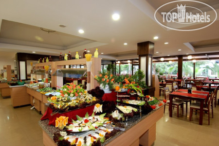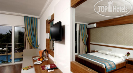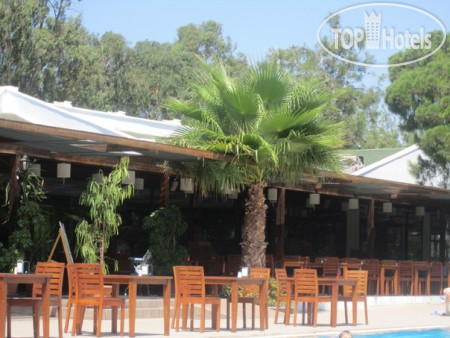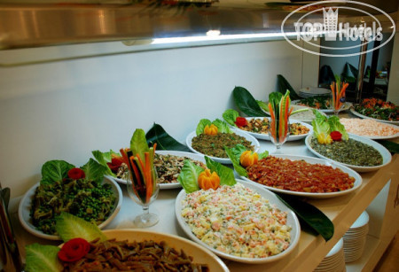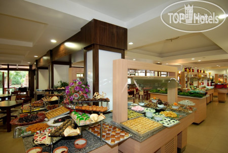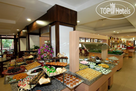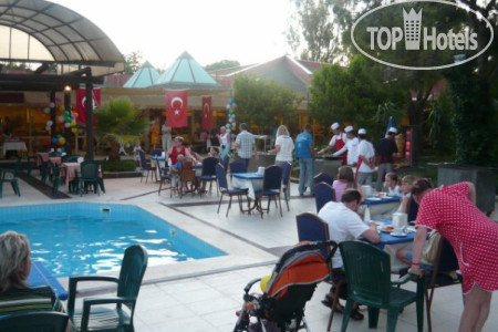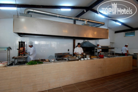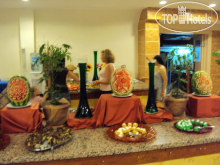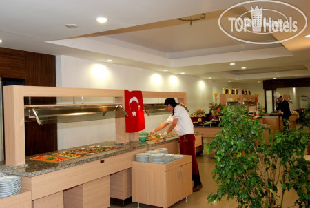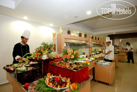 Что понравилось в отеле, дак это ЕДА! Выбор огромный!!! На обед, ужин - куриный шашлык, говядина, рыба, курица, макароны, колбасы, сыры, овощи, булгур, нут, супы, котлетки, огромный выбор салатов и заправок к ним, оливки, маслины, пирожные (в основном манник разных цветов и муссовые), пахлава, из фруктов давали 1 раз арбуз, 2 раза дыню, каждый день яблоки, апельсины, виноград. На завтраки - яичница, сосиски, омлет, панкейки, мёд, разные варенья. Чай, соки, вода, кофемашина. В общем едой мы остались мегадовольны, ни взрослые, ни дети не останутся голодными, факт! С 10 до 23 работает бар на бассейне (их 2, как и количество бассейнов), вот это не очень удобно, работает то один, то второй. Из спиртных напитков вино белое/красное сухое, пиво, водка, джин (джин отвратительный!!! Мне кажется его вообще никто не пил в отеле). С 14 до 16 на баре есть картошка фри с кетчупом, бургеры.