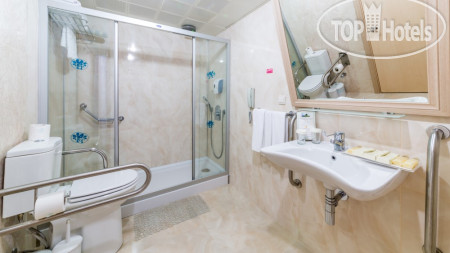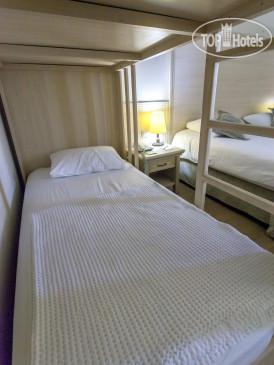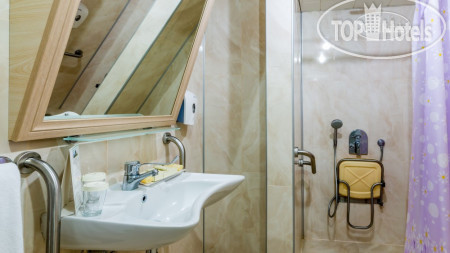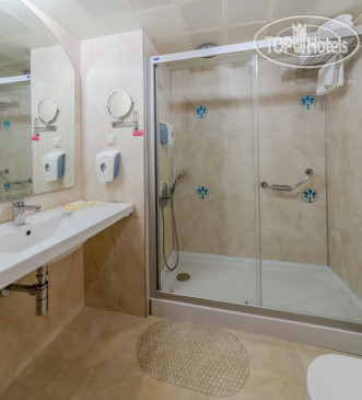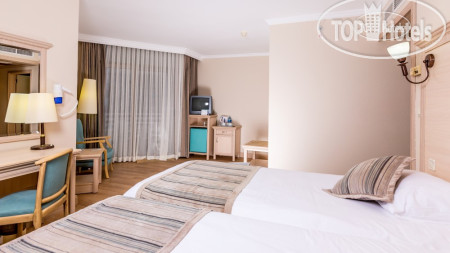 Удивило отсутствие мыла и шампуни в ванной комнате, вместо которых установлены два кассетных дозатора, с жидким мылом - над раковиной, с шампунью и кондиционером - на стенке душевой кабинки. Сам номер - "стандарт", с небольшим балконом и сушилкой на стенке. " Эконом" брать не рекомендую, он - без балкончика и чаще всего выходит на шумную, тыльную от моря часть отеля. Сантехника и вся мебель - новые, без изъянов, немного огорчила очень маленькая подушечка на кровати.