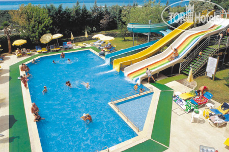 На территории 2 бассейна. Один поглубже (1,40м), один 1,10 с 3 горками (с горок катаются как взрослые, так и дети)