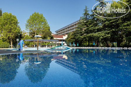 Хочу поделиться впечатлениями о Бургас, в который попали совсем случайно. Приятный отель /санаторий, в котором при желании можно и подлечиться. Большая территория, свой пляж, что немаловажно, зона бассейна, ну и все включено, как любит российский турист. Мы жили в главном корпусе на 1 этаже с ремонтом. Очень уютно и комфортно. Есть чайник, кружки, холодильник, сейф. Да, без балкона, но сами такое выбрали. Зато есть сушилка. Вот это был приятный сюрприз. В номере есть так же фен, правда работал странновато: пытался сжечь и так подпаленные солнцем волосы. Сразу скажу, что мы приехали рано, а заселение в 14 часов. Завтрак был не предусмотрен, но с браслетом мы смогли выпить чай, сок и поесть вафли у бассейна. В час нас пустили пообедать, и тут же с ресепшена позвонили, что наш номер готов. Вылет был поздним, смогли воспользоваться услугой продление номера. Есть на 4 и 8 часов. Мы брали 8, поэтому в него вошло ещё и питание.