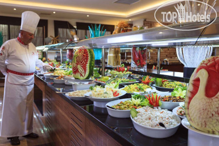 Кухня стала ещё разнообразнее и вкуснее. Рыба всех видов, баранина, курица, индейка, креветки, крабы, раки, кальмары, фаршированные мидии, разнообразные фрукты, ооогромное количество пирожных, тортов, выпечки, разные виды закусок, роллы! Всего не перечислить! Питание в отеле почти круглосуточное. Без еды и напитков не останется никто.